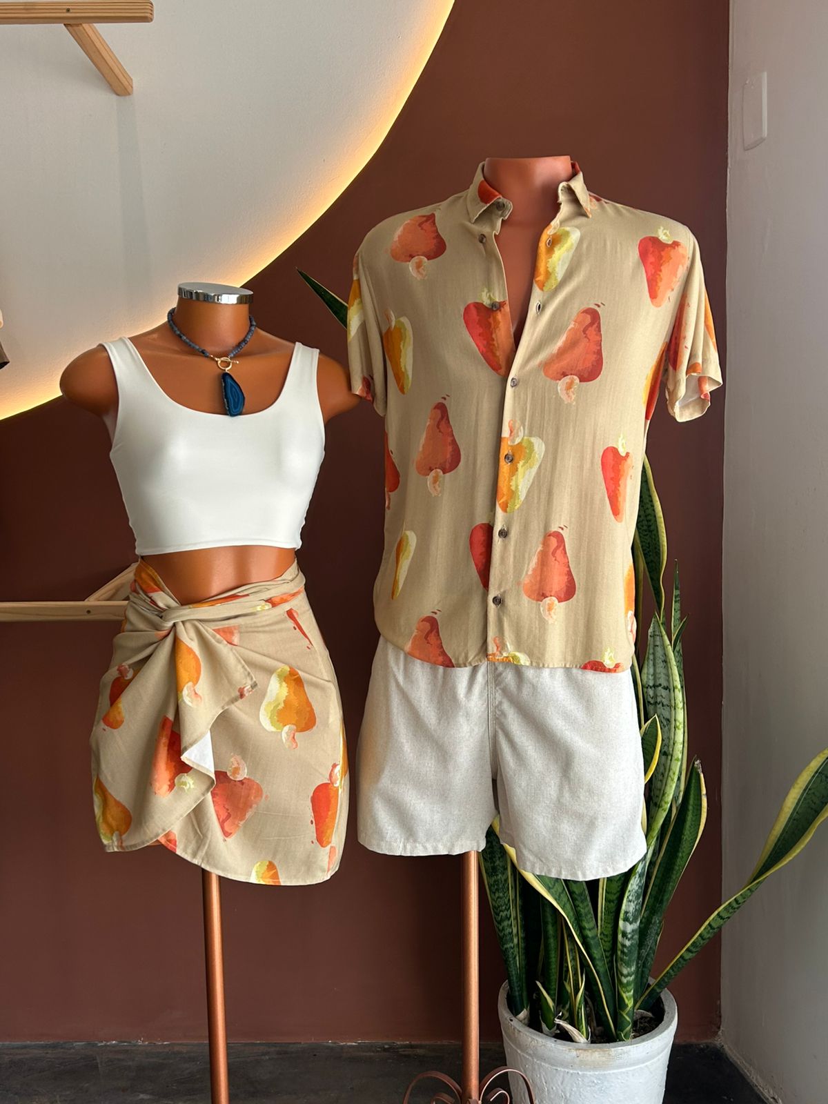 🌿 Estampa autoral e exclusiva: Chuva de Caju (cajus aquarelados) em fundo creme escuro desenvolvida pela artista local Amanda Caetano.