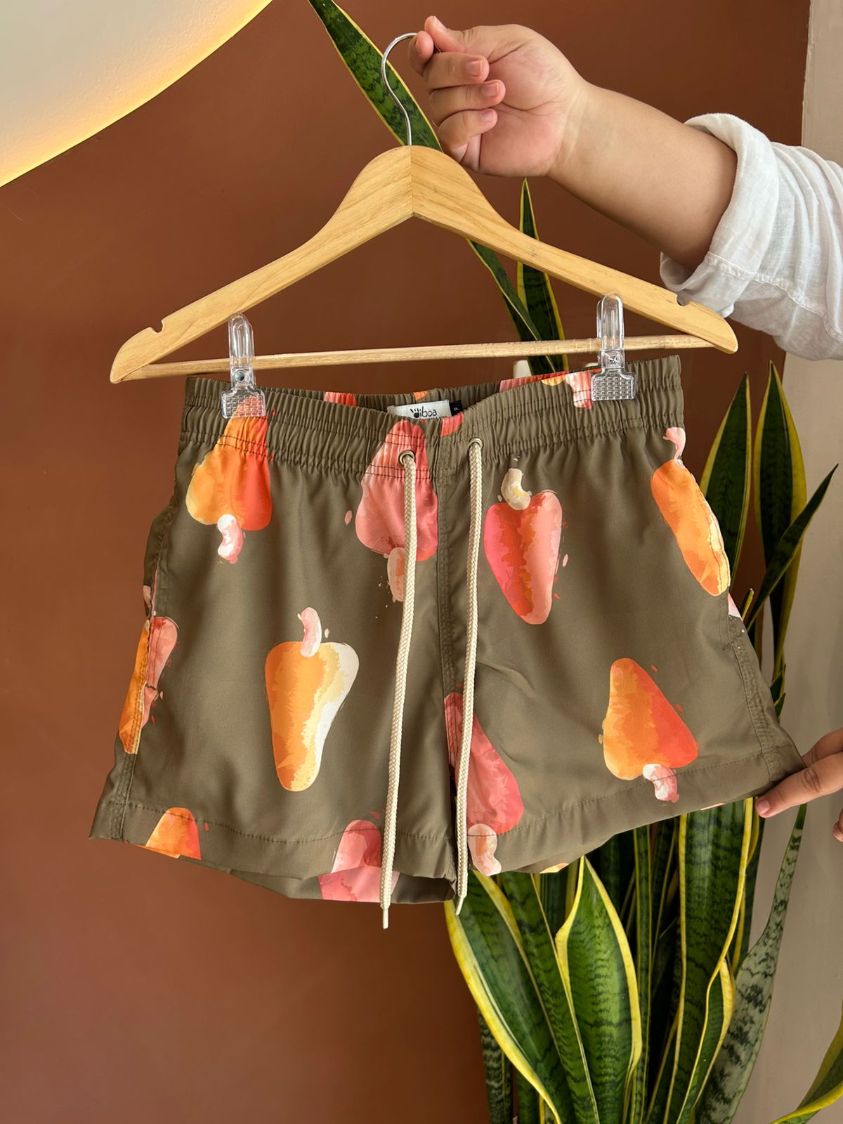 A estampa exclusiva Chuva de Caju foi desenvolvida pela artista local Amanda Caetano, trazendo um toque autêntico do Nordeste para o seu look.